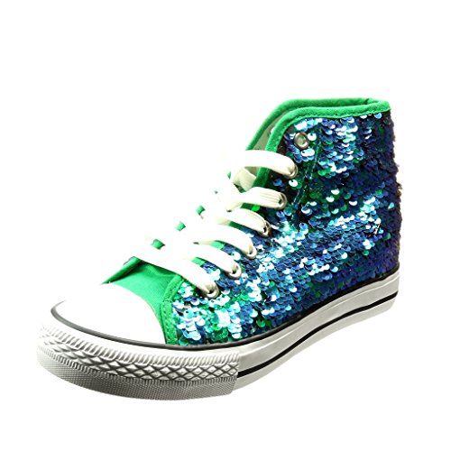 Women's Fashion Shoes - Trainers Angkorly authentic and new. Fashion Shoes in Color Green - Design : glitter. Outer Material : textile - Insole : textile - Sole Material : rubber - Heel : flat heel - round-toe - Shaft Height : high-top - Closure Type : Lace-Up.